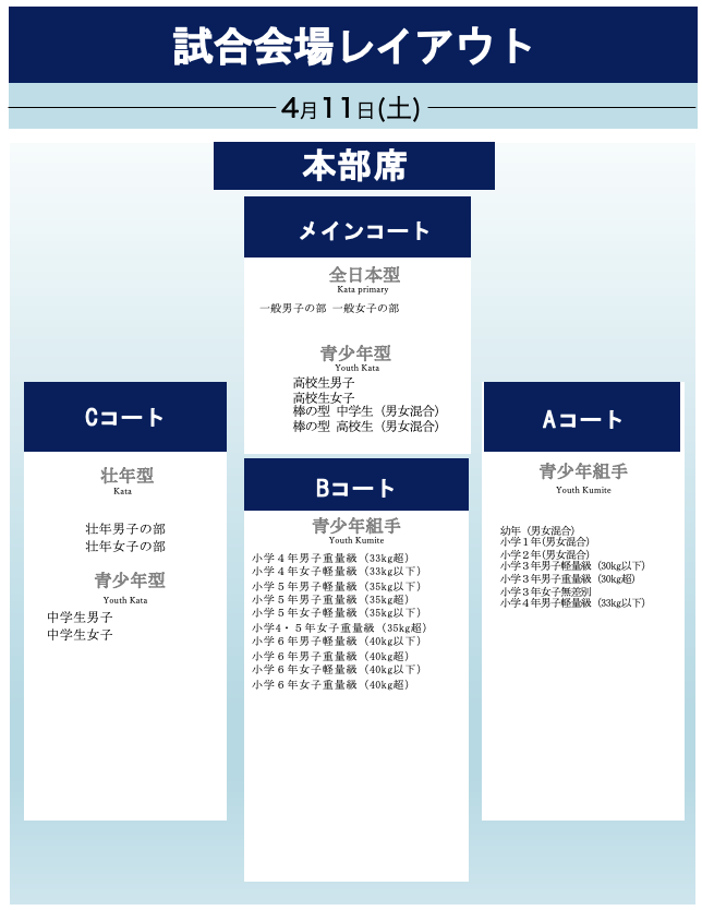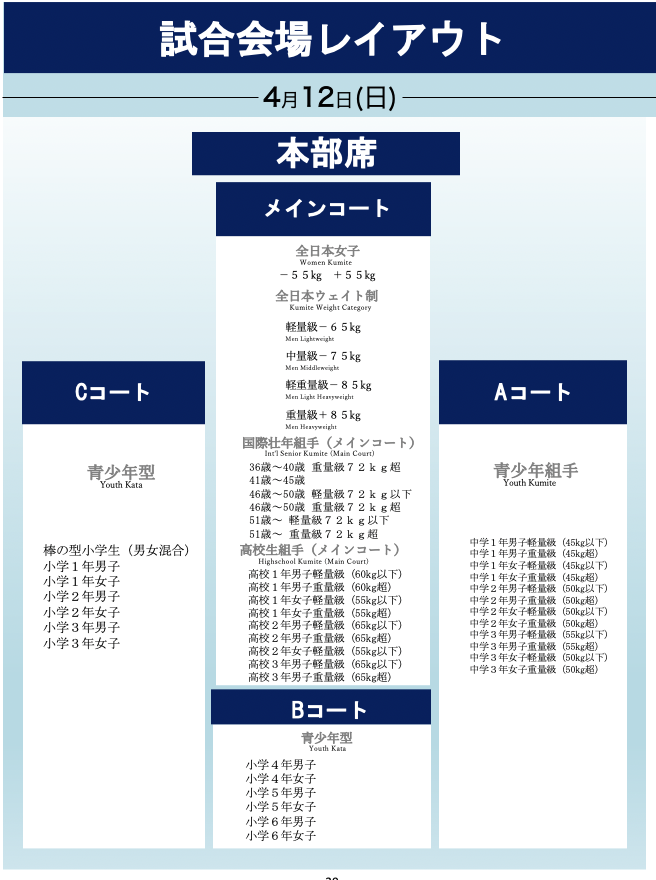 各カテゴリーの受付コートは以下の通りです。